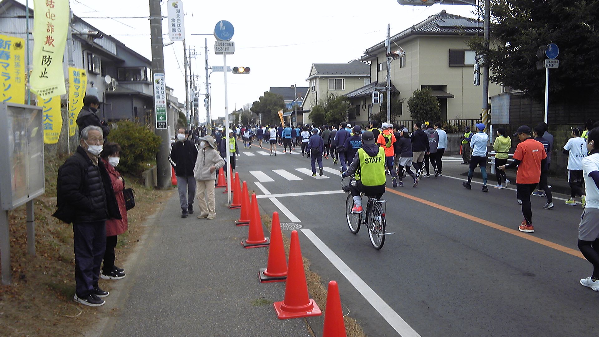 スタート/ゴールのゲートは住宅街の中。片側1車線を両側使うので2車線になるが、同時にスタート/ゴールできないのが難点である。だから、5kmと10kmがゴールしないと小中学生はスタートできない。