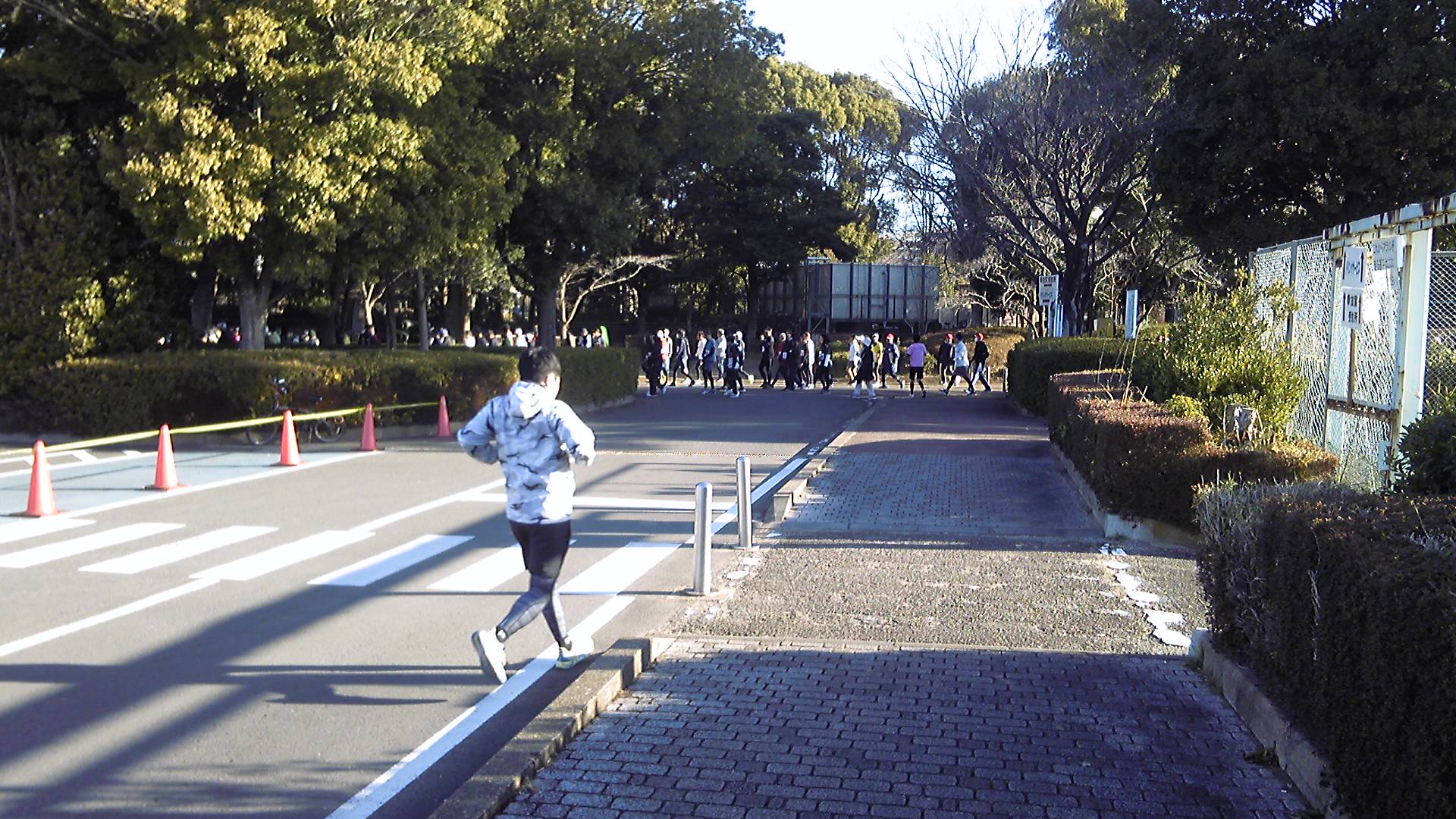 トップは例によって中央学院かと思ったら、「H」の法政ユニフォームである。2番手も招待選手(市内出身の箱根駅伝選手)。中央学院は3番手で、10人以上の集団で走っている。自転車レースだと勝つために集団で走り風よけで体力を温存するのだが、果たしてゴールはどちらが前だろうか。中央学院勢の後ろから、一般参加のトップグループが続いた。
