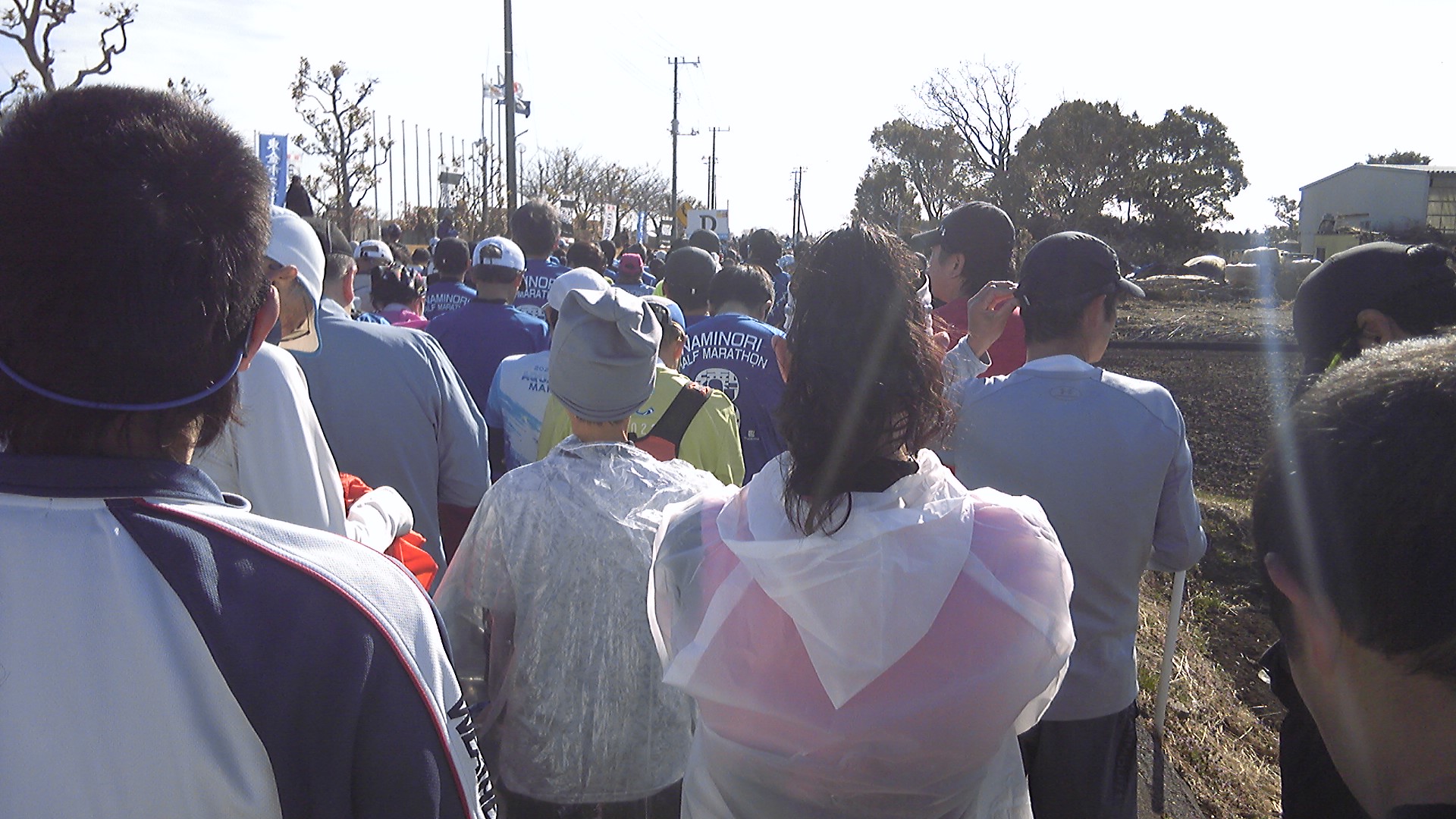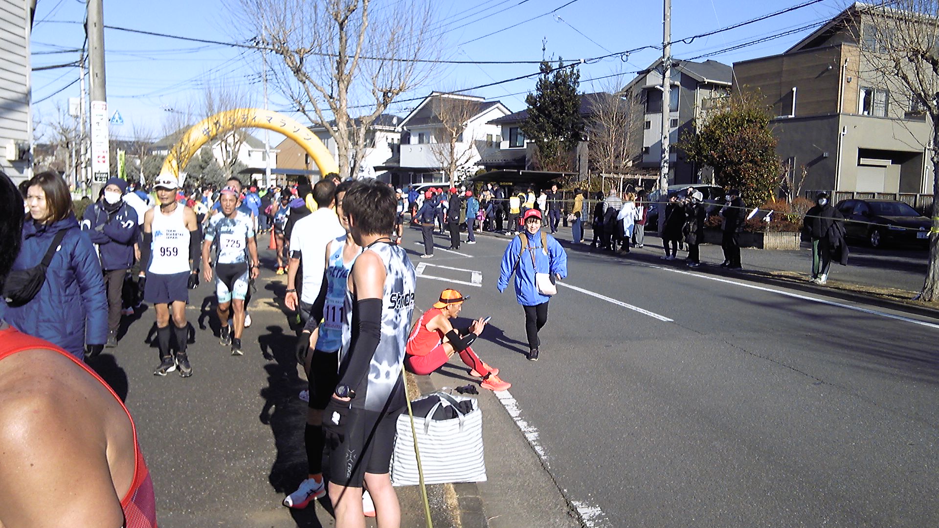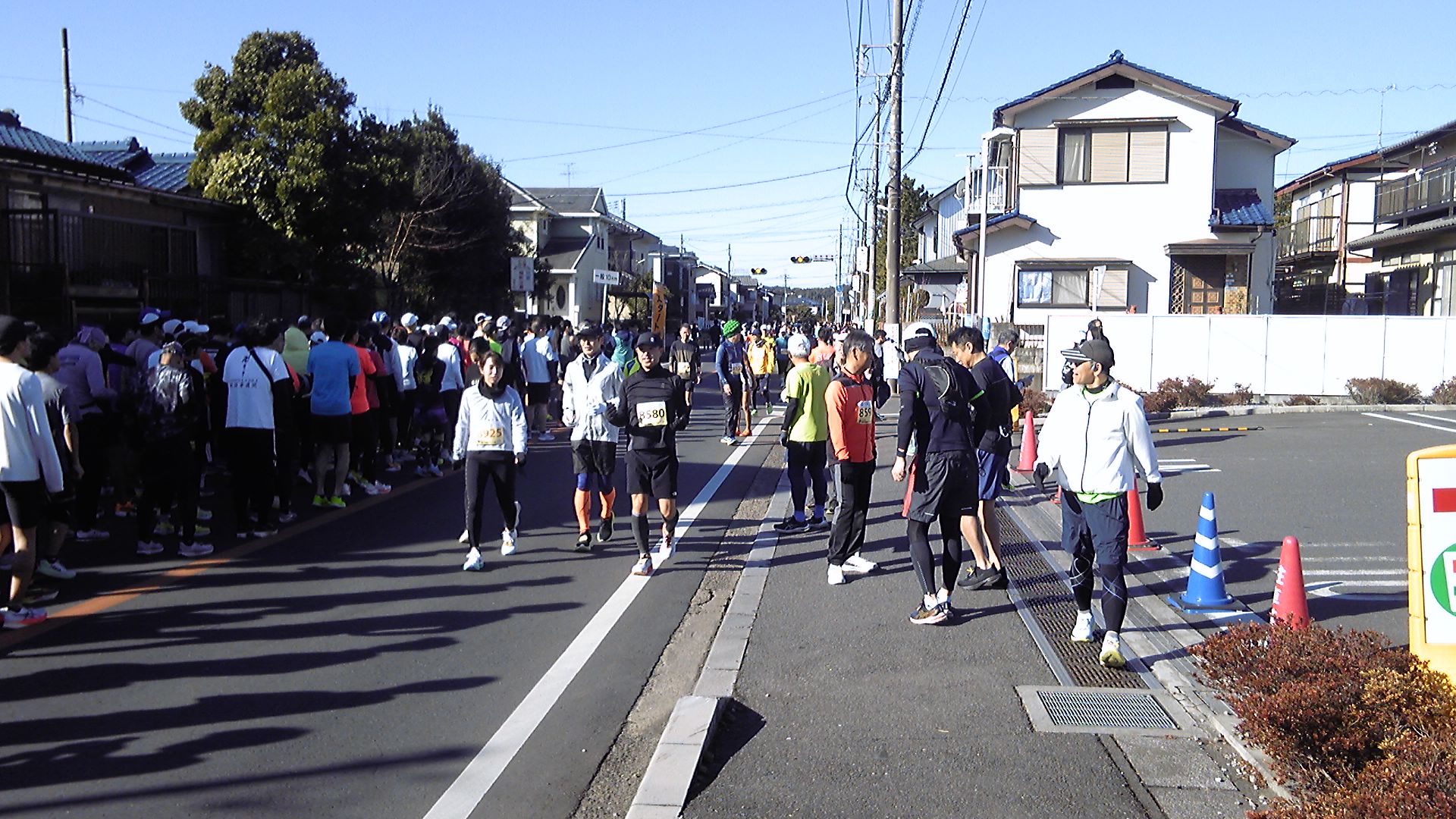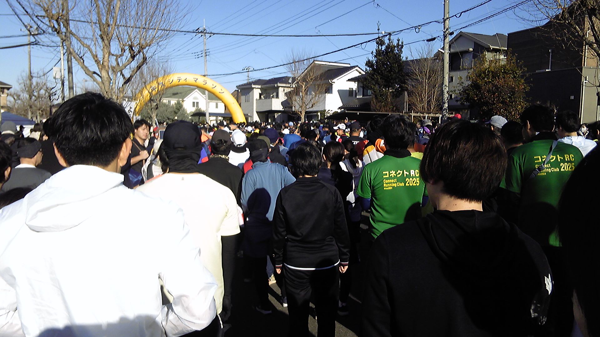 ネットタイムは測らないので、スタート地点に計測マットはなく線が引いてあるだけである。昨年は寒くてじっとしていられず、何人かが列の後ろでダッシュを繰り返していたけれど、今年は日なたに集まってしゃべっているグループが目立つ。