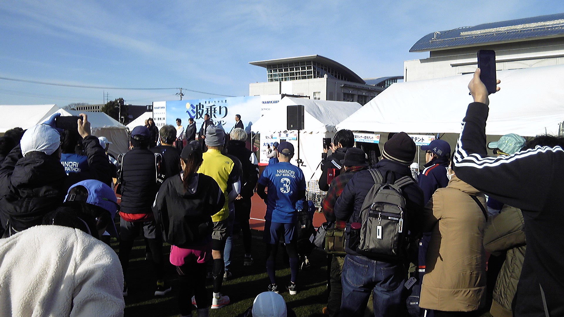 自分だけ目立たないように、さりげなく地元出身の新日本プロレス・永田に話を振る。レスラーだから上半身裸だが、お客さんを前にすると寒さなんて感じないそうだ。そうこうしていると、あっという間にスタート1分前。忘れないうちに、ガーミンを起動する。