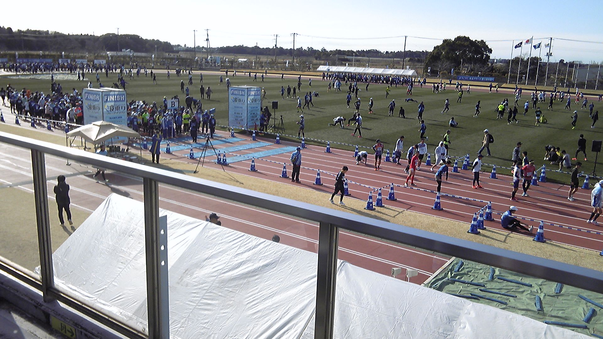 体育館内が一杯なので、吹きっさらしの競技場スタンドでスタートを待つ。待機の列がよく見えたので、Dスタートが正面に来るのを見計らってスタンドから下りた。