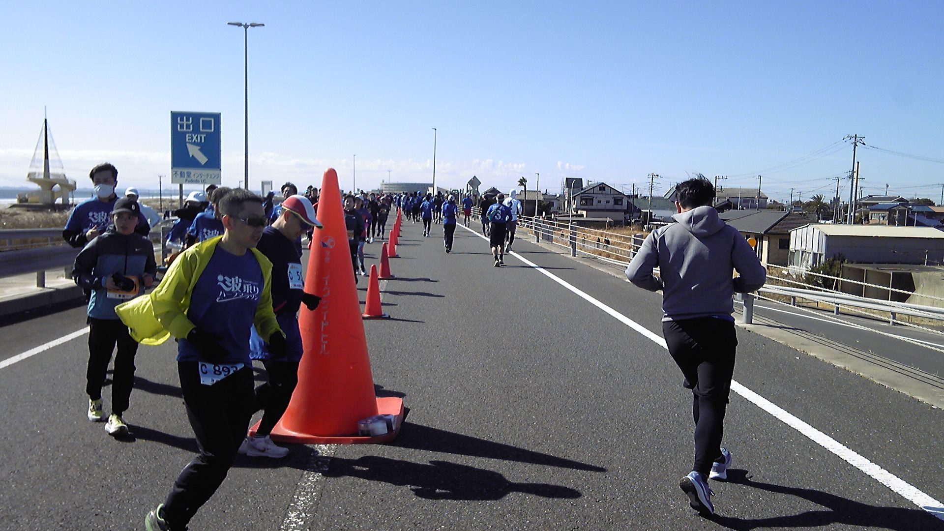 折返しでいったん止まって折返しコーンを撮影する。これはレース前から考えていたことで、レース中に注目ポイントを撮っておこうと思った。折返し地点は九十九里浜沿いで、絶好の撮影ポイントである。スタート時のロスタイムが大きすぎたので、少しリラックスしたこともある。レース中に意識して立ち止まったのは、初めてである。