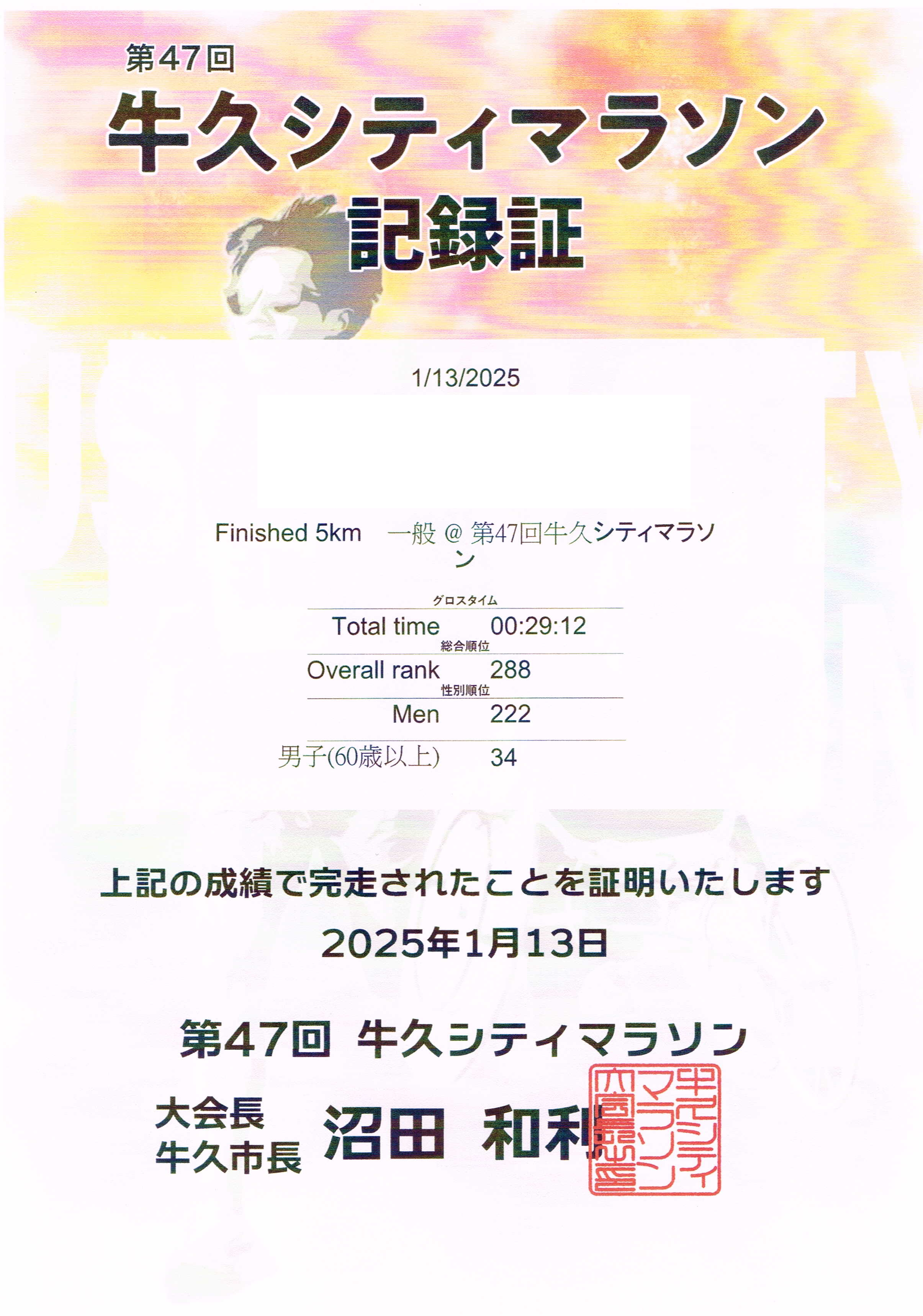 結局、記録証はランネットからは出力されず、MYLINKという別のサイトから提供されることが牛久市のホームページで発表された。まぎらわしいことである。グロスが29分12秒、ネットが28分52秒で、みごと目標を達成することができた。それと驚いたのが、544人参加中288位という順位で、ほぼ真ん中あたりでゴールしたことになる。男子60歳以上だと、85人中34位である。そんなに速いのか。