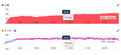 問題の心拍数だが、ラスト1kmで平均152、最大160。思ったほどよくなかったが、先週のようにひどいことにはならなかった。残り1kmまで最大心拍数が150に届かなかったから、徐々に改善しているようだ。