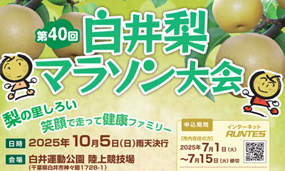 第40回を迎える白井梨マラソン、3年ぶりの参加になる。今年は10kmに挑戦するが、酷暑で梨の出来がイマイチという噂もあり、どのくらい提供されるか興味深い。