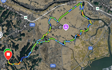 関東ロードレース10kmコース。YouTubeの動画をみて見当をつけ走ってみた。東(成田市街)も西(捷水路をはさんで印旛村)も高台で、北風が吹き抜ける地形。当日は風注意である。