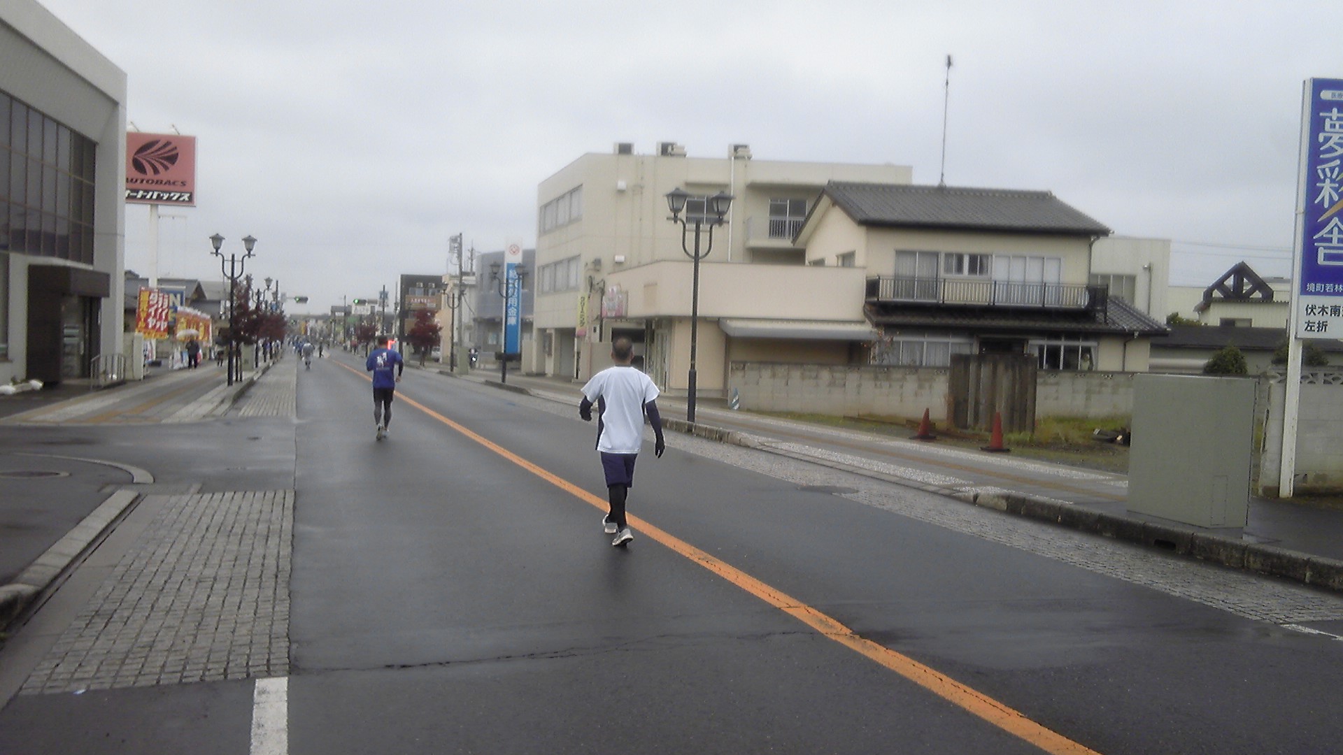 微妙なアップダウンのほぼ直線を約1km、セブンイレブンの角を左折する。アップダウンは記憶通りきつかったが、始めの1kmは7'14"。そんなに悪くない。県道には、10日後マラソンで通行止めの掲示が100m置きくらいにある。トラックが多いので、段差のある歩道を苦労して走る。当日は車道を走れる。
