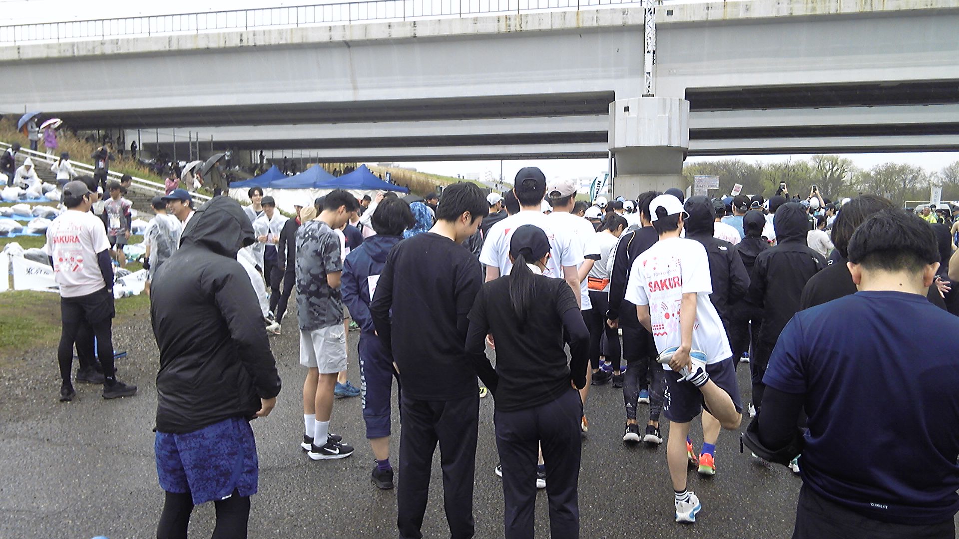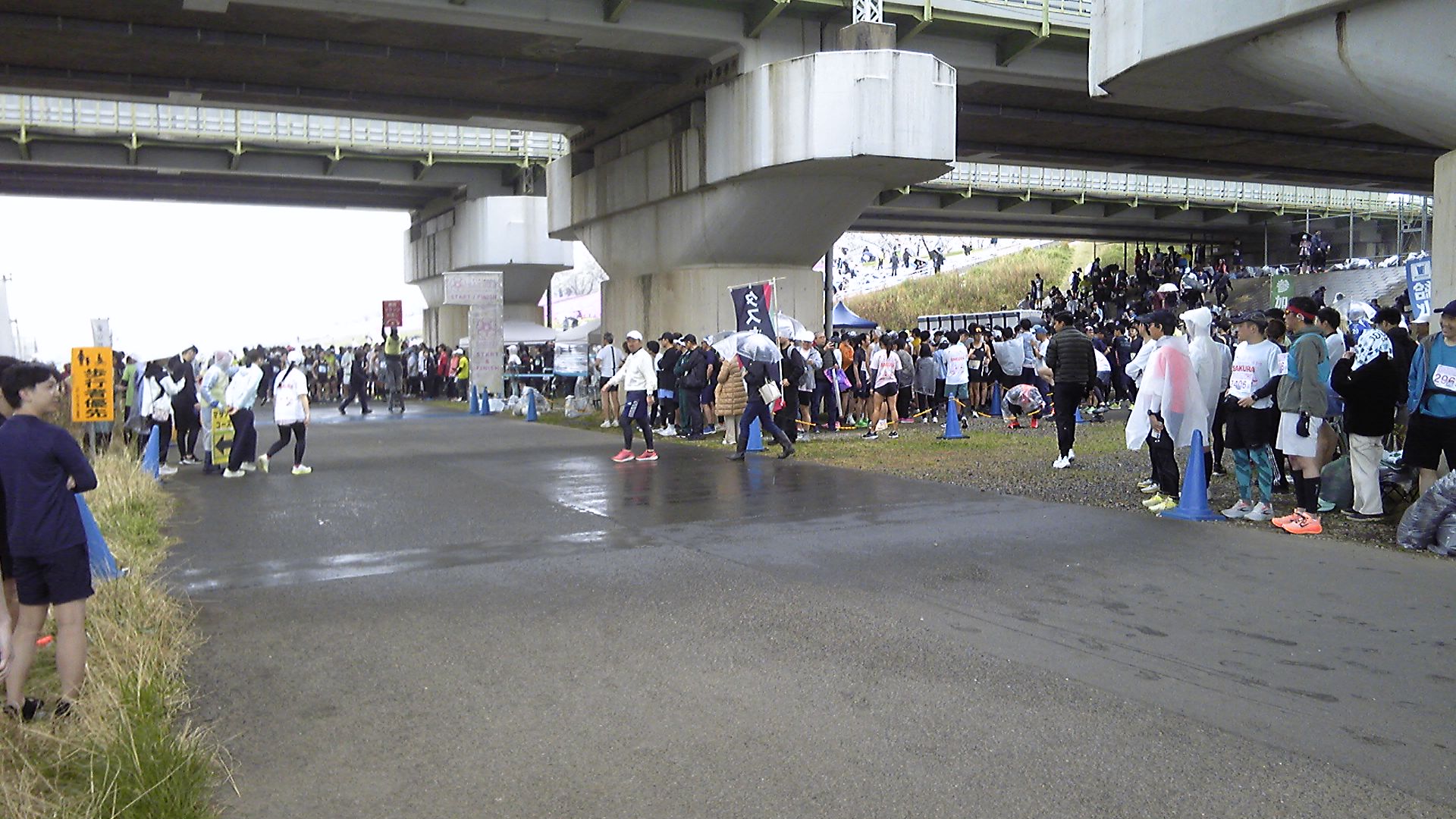 そうしている間に、ぽつぽつ降ってきた。「雨は午後からの予報なのに」「この後ずっと雨ですかね」とみなさん気がかりな様子である。スタートも迫っているので、鉄橋下まで下り男子トイレの列に並んで時間調整。すぐにスリークォーターのスタート時間になった。