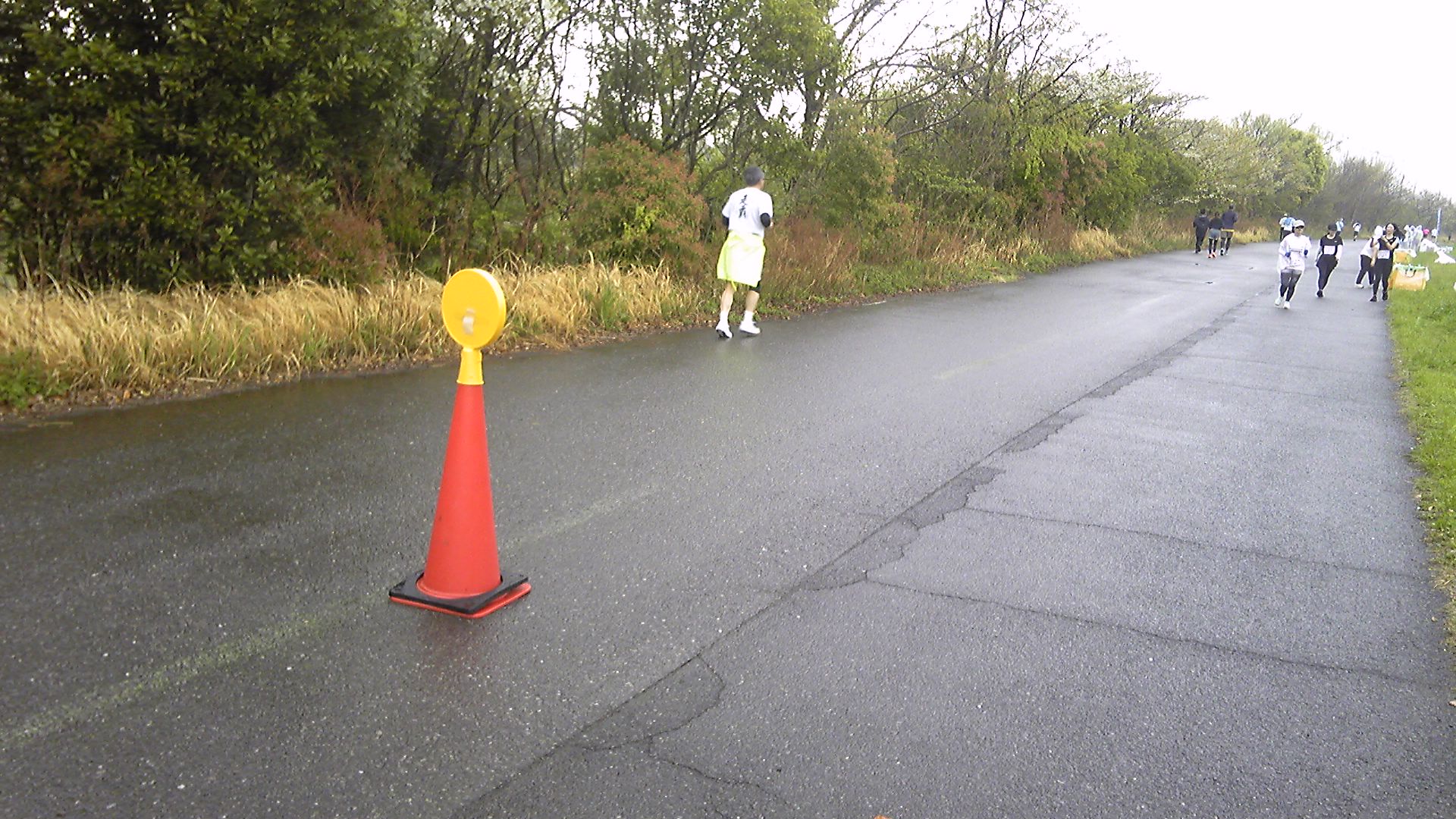 いつもどおりガーミンの表示を心拍数に固定。とりあえず143。練習では130台前半なのだが、冷たい雨というコンディションではやむを得ないところか。何ヶ所かスロープをやり過ごし、給水所を過ぎてしばらくすると西側折返しである。まだ給水を取るタイミングではない。