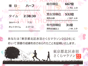 ようやく京浜東北線の鉄橋が近づいた。20kmのラップタイムは8'01"、21kmは7'43"である。とてもビルドアップとはいえないが、ともかく7分台後半でゴールできたのはよかった。ゴールして左にコースを外れて記録証発行所へ。タイムは2°38'30"、ネットだと約1分少ない。目標タイム達成である。
