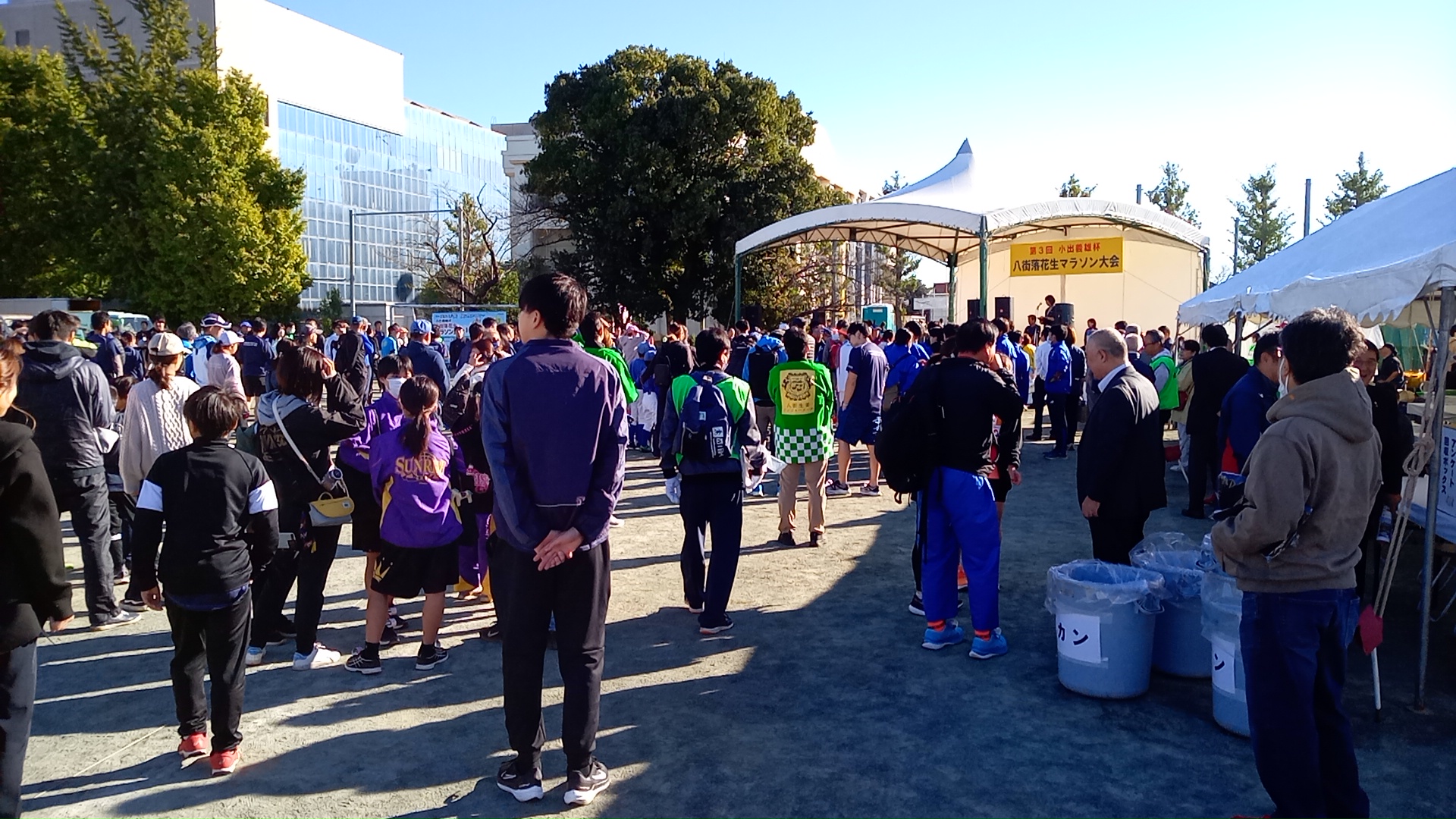 八街中学校に特設されたステージで開会式。絶好のマラソン日和で、先着1,500人の参加者のうち、すでに何百人か集まっていた。