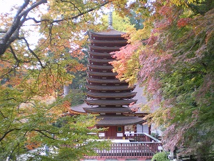 京都・大津方面になじみの深い天智天皇であるが、蘇我氏打倒の陰謀を中臣鎌足と密談したのは、奈良県南部多武峰(とうのみね)、現在の談山神社であったとされる。十三重塔と紅葉で有名。出典:(個人撮影)