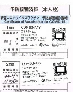 2回接種済の予防接種済証。外国で通用するようCertificate of Vaccinationと表記されている。そういえば、輸出書類の原産地証明をCertificate of Originということを思い出した。