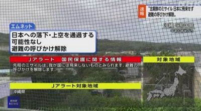 この状態はアラートが解除された7時過ぎまで続いた。民放をみると、通常番組の中でJアラートが発表されたことを採り上げていたが、NHKは地上波が那覇や石垣島・与那国島からの中継で、BSはJアラートの警報画面一択である。