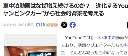 YouTubeのおすすめ動画に、よく車中泊ものが入ってくる。最初の頃らんたいむとか見ていたが、やがてあまり見なくなった。遠くに出かけて、好きな場所で安く泊まりたいという気持ちはあるが、実際に動画を見るとあまりわくわくしない。