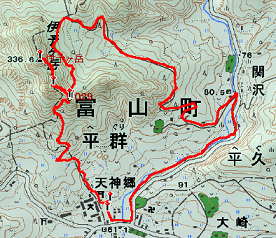 家に帰ってからGPSデータをカシミールに落としてみたところ、撤退地点までは市町村界を忠実にたどっていて、行き着いた場所は1/25000図上では林道が通っているはずのところなのである。ちなみに木之根峠はその先の鞍部で、市町村界をそのまま進み標高差で40mほど下っているように見える。