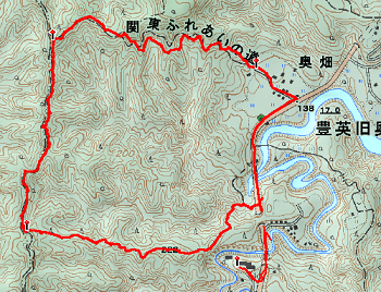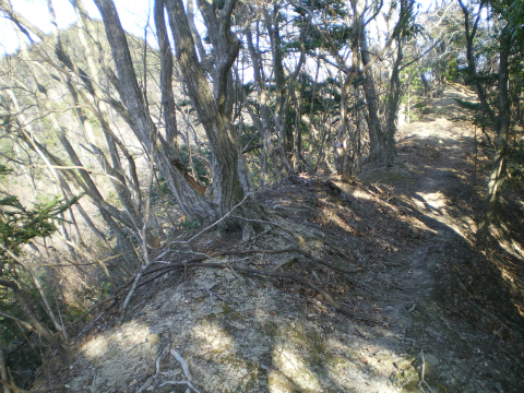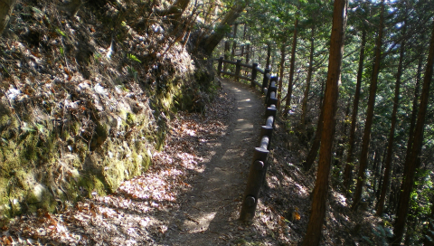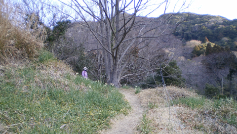 後から考えるとあせることは全くなく普通に歩けばよかったのだが、2度ほど間違った道に入りかけて気があせっていた。帰りのバスの時間とか、できれば日帰り温泉で温まって帰りたいなどと思って、分岐から自分としてはかなりのハイペースでアップダウンをこなす。ここはもうすでに関東ふれあいの道ではないので、手すりもなく地盤も整っていないので余計に負担がかかる。