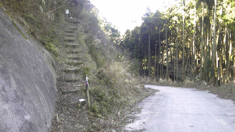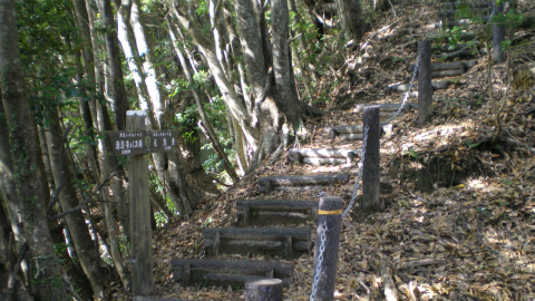 舗装道路から左へ、急坂を登る登山道の入口がある。どうやらここを通って戻るようだ。舗装道路を通って戻れるといいのだけれど、このまま進むと白狐川に沿って竹岡まで下ってしまうようだ。竹岡といえば鋸山を挟んで反対側なので、ICで二つ違う。