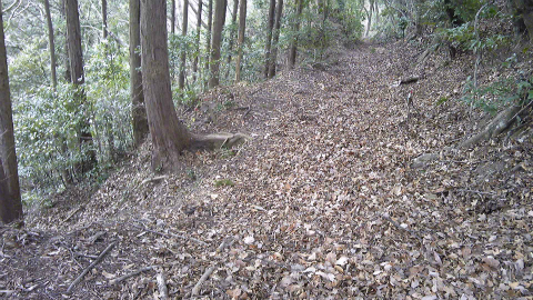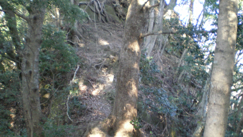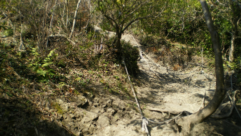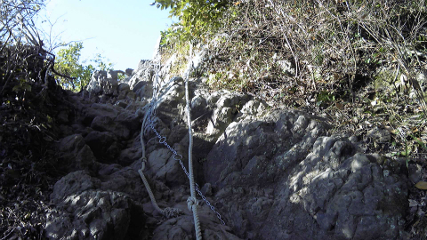 トンネルの高さくらい登ったかなと思えた頃、右に方向転換。さらに急こう配を登る。左が切り立った崖になり、トラロープを引いてある部分をクリアすると、やや太くなった登山道に出た。田倉集落から鹿野山への古道「田倉みち」である。「房総のやまあるき」では田倉集落に出てこの道をたどることになっており、ここでようやく、モデルルートに戻ったことになる。