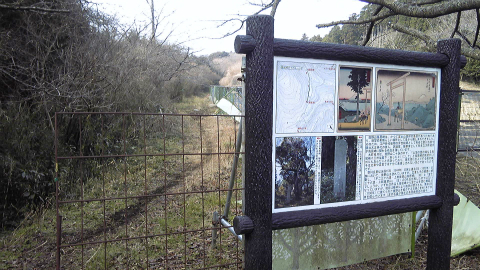 三角点からの展望をしばし楽しんだ後、観測所を後にする。5分ほど歩くと鳥居岬の案内板があり、どうやらそこから古道に入るようだ。説明版の裏は広大な空き地となっている。ここには以前、国民宿舎鹿野山センターがあったらしい。