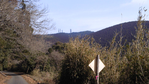 しばらくすると鹿野山頂上の電波塔が見え、かなり標高が下がっているなあと思う。そしてこの林道、地図のとおりに谷を巻いて大きく迂回していて、距離はたっぷりある。その代わりに起伏はほとんどないので、私の好きなパターンであった。