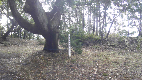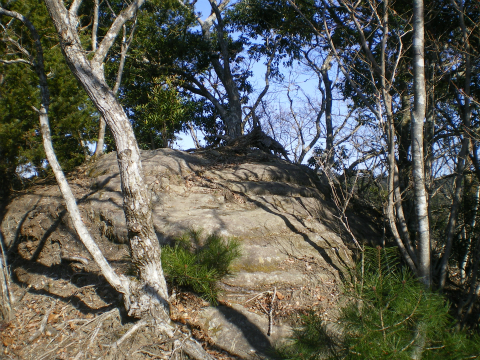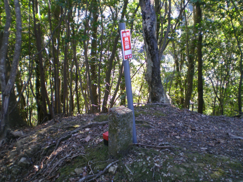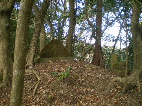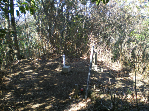 尾根を外さないように高い方へ登って行くと、次第に踏み跡がはっきりしてきて、小高いピークの上に自然石を削った石碑が見えてきた。「嶽神」と彫ってあり、おそらく山の神を祀っているのだろう。傍らには小さな石仏の観音様もある。ここが御所覧場で、昔、里見の殿様が振り返って安房の景色を望んだ場所ということである。いまは木々が茂って展望は開けない。