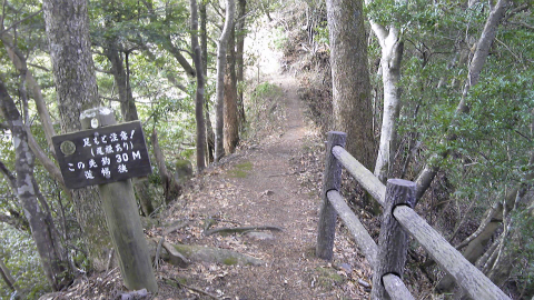 案の定、登山道に入るとこれまでの演習林作業道とは違って難易度が上がる。とはいえ、関東ふれあいの道は個人的に「高速登山道路」と呼んでいるくらい整備されている。基本的に起伏はなだらかで路面は平らであり、危険個所は手すりや柵で安全なように手当てされている。房総に付きものの小ピークの登り下りはトラバースされ、やせ尾根には注意書きがある。