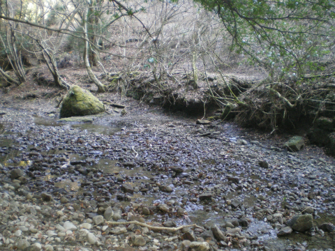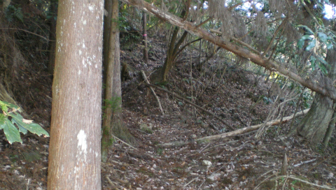 谷沿いの細い道は斜めっている上にすれ違い困難なほど狭く、谷にかかっている丸太橋は半ば腐ってしまっている。その奥には田圃があるし、宅地の跡らしき平地もあるので百年くらい前にきっと人が住んでいたのだろうが、いまでは水仙畑が少し残っている他は荒地となっている。そこから上は深くえぐれた登山道である。