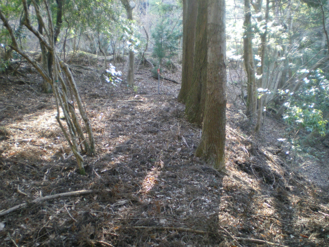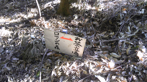 大山林道に入って10分ほど歩くと、峠のような地形になった。ここから先は道は下っているので、峠というからにはこのあたりである。踏み跡をみつけて藪の中に入る。「房総の山歩き」には有志が下草を刈って行先表示も設置したと書かれているが、探したけれど見つからない。よく見ると藪の中に倒れた石碑がいくつかあるので、落ち葉を踏んで上に向かってみる。