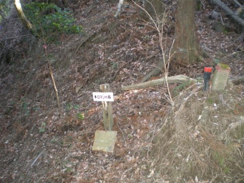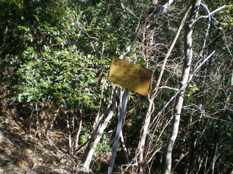 次に失敗したら清澄寺まで戻るしかないと思ってさらに100mほど進むと、北側の斜面を登る道があり、「三石山」の手作り標識がご丁寧に2つも置かれている。行きにちゃんと前を向いて歩いていれば見逃す場所ではないのだが、何をぼんやりしていたのだろう。時刻は13時30分、頂上から35分だから、分岐が分からないでロスした時間は10分くらいだったはずだ。