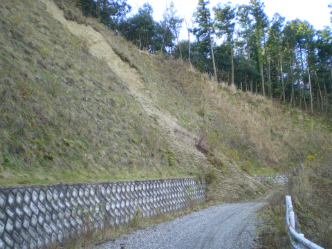 ではモルタル通りにしなかったらどうなるかというと、下の写真のような土砂崩れ現場となる。第一の現場では、高さ十数mにわたり表層の土砂が流れてしまっている。房総の山奥の土砂はこうした砂っぽい水気を含むと崩れやすい地盤が多い(こことかここ)。思うに、有史以来何回も噴火している富士山の火山灰の影響ではないだろうか。