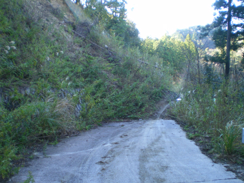 土砂崩れその2。土砂の下にも石垣は続いています。斜面は20mくらいの高さで、ヘアピンカーブで下りてくるとこれ。このままひと夏越したようです。