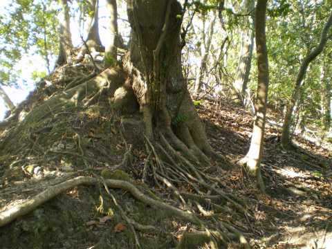 とうとう尾根道は、左が崖というとんでもない場所にさしかかる。見た目20mくらいは垂直に切り立っている。足を滑らせたら、ケガで済むかどうか微妙なところである。そして、足もとの木の根の間から中空が見える。どうやらオーバーハングしているようだ。