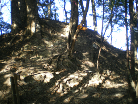 さて、木之根峠はこの先なのだが、行先表示もなければ赤テープも見当たらない。唯一手がかりとなるのは頭を赤く塗った杭で、おそらく市町村の境界を示すものと思われた。コピーをとってきた「房総の山歩き」には、「自然林の尾根を少し行き、道は尾根の西側山腹をたどるようになる」と書いてあるのだが、少しというのはどの程度なのだろう。