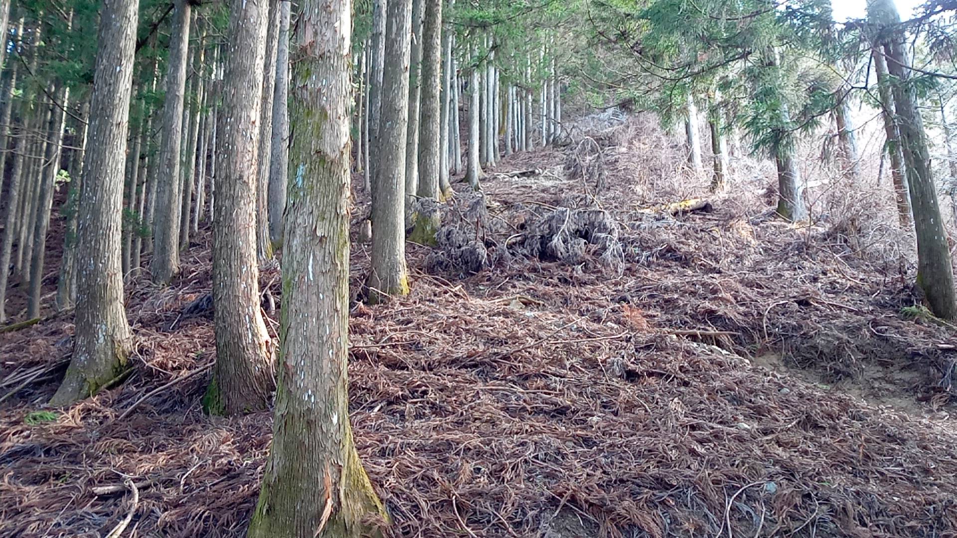 古礼山の登りでも目についたのだけれど、水晶山はそれよりはるかに多い。水晶山を遠くから見ると山腹の斜面が大きく崩れ、茶色くなっているのが見える。あるいは、地下の水脈がなくなって、木が育たなくなっているのだろうか。