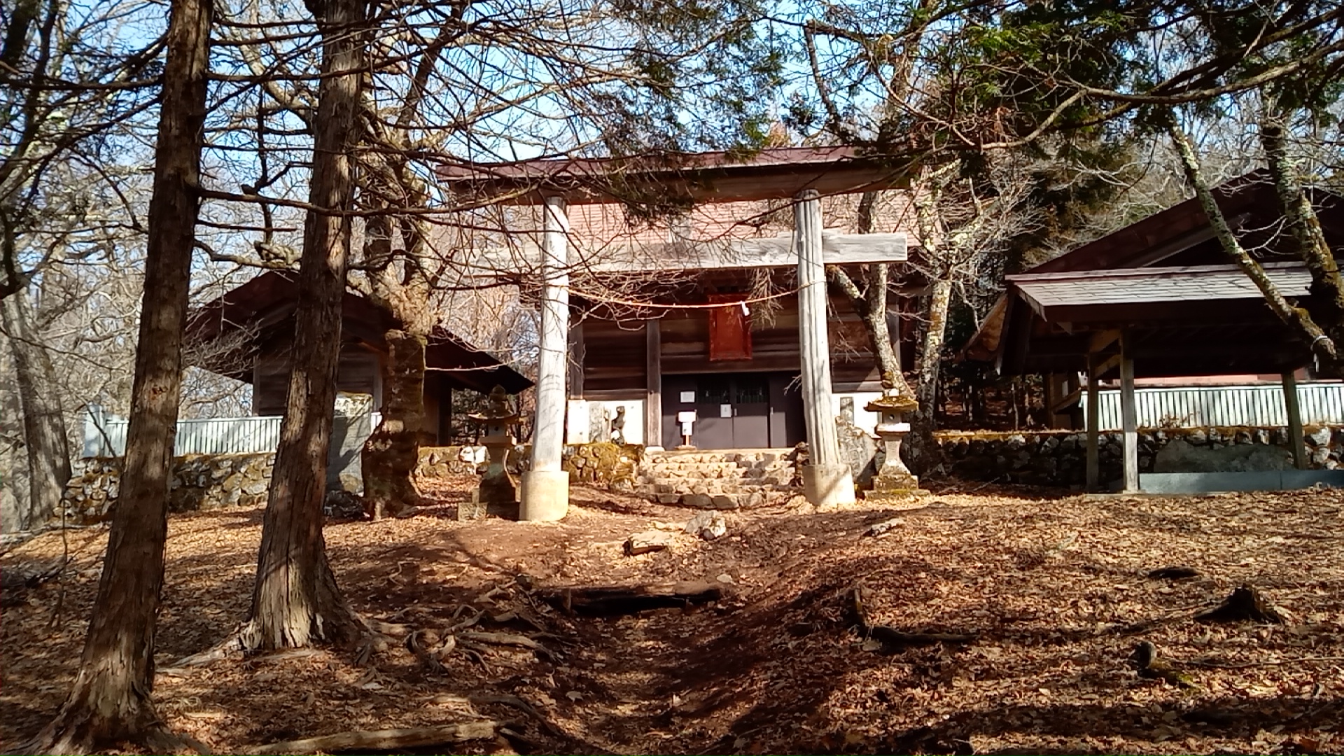 分岐から先は、傾斜がややゆるやかになり頂上広場となっている。右手にトイレの大きな建物があるが、3月は冬季のため使用不能である。少し上がった場所に大きな鳥居が見える。御嶽神社である。