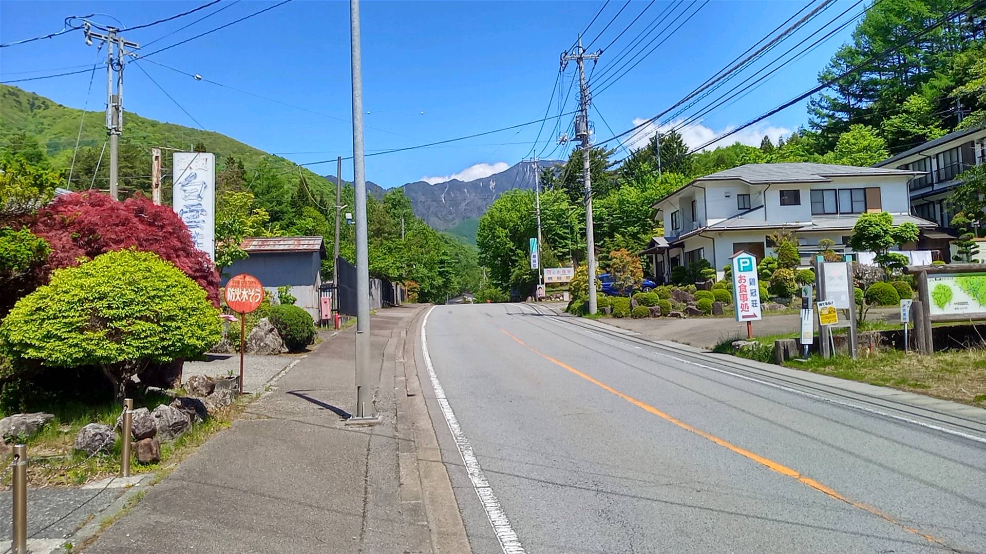 新地平バス停で下車。バスの中は半分くらい席が埋まっていたが、新地平で下りたのは私とシニア単独行の2人だった。西沢渓谷方面は青空が広がっている。