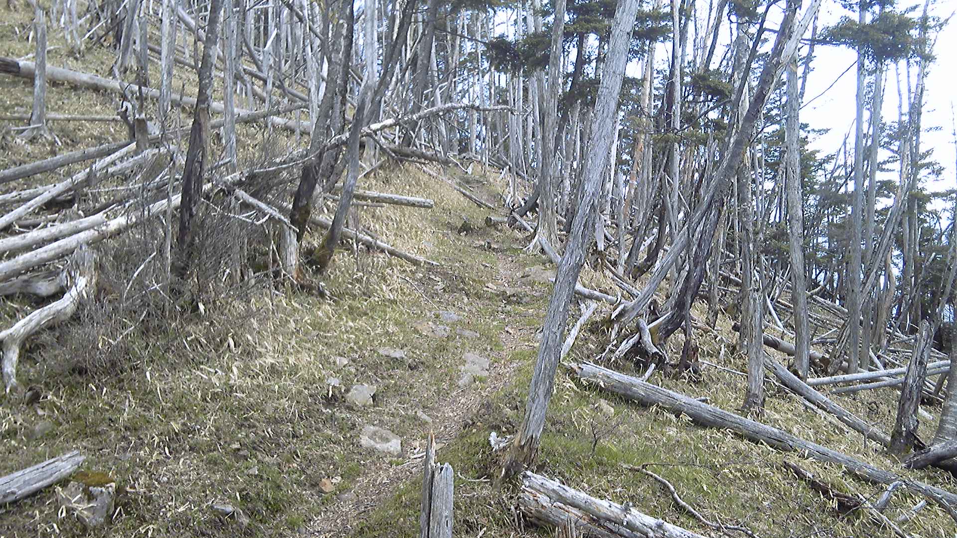 水晶山の登りでは、これまで以上に倒木や立ち枯れた木が目立った。