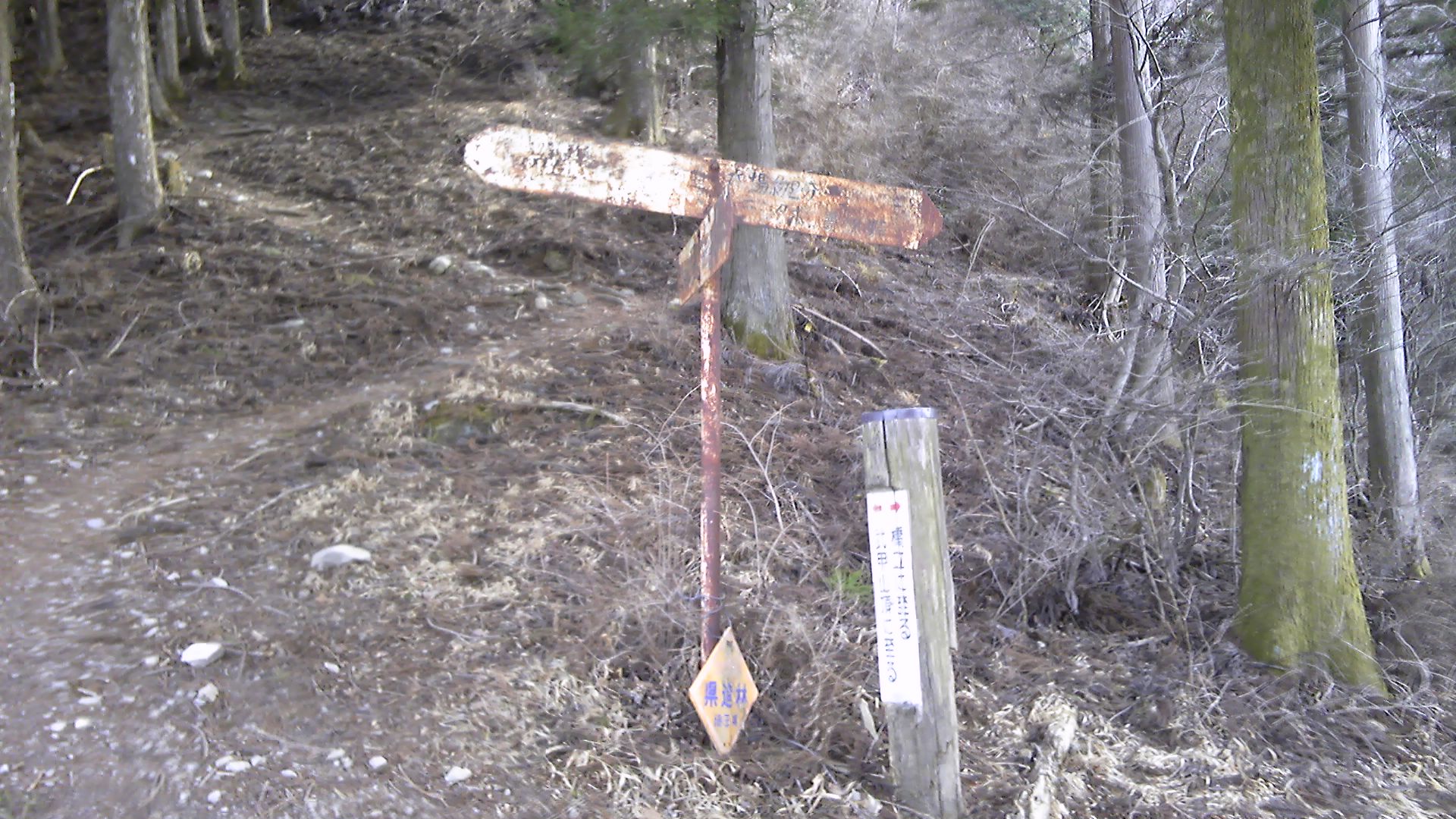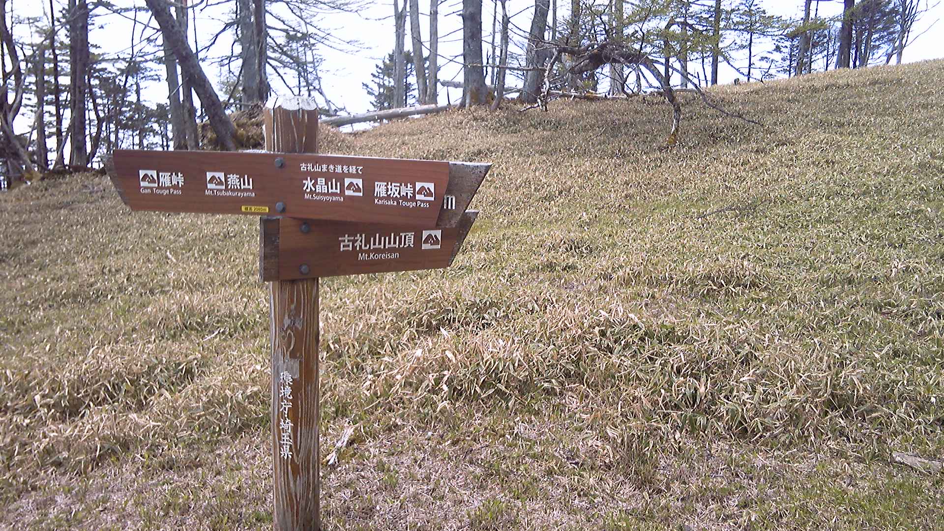 さらに30分、立ち枯れた木が多く見晴らしがよくなった場所に、案内表示板の目立つ分岐点があった。右に進むと巻き道、左が古礼山山頂への道である。山頂へは、まだかなり登らなければならないようだ。