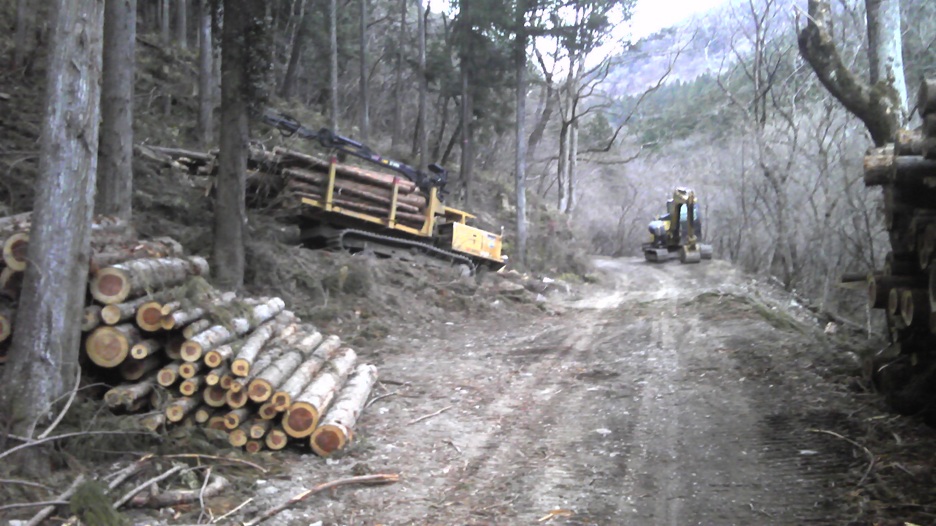林道の両脇に、丸太が大量に積まれている。太いのやら細いのやら様々で、左側の傾斜地から滑り落としたもののようだ。この先に崩壊地があるようなことも書いてあるので、災害復旧のために使うものだろうか。ブルドーザーや軽トラも、止めっぱなしになっている。