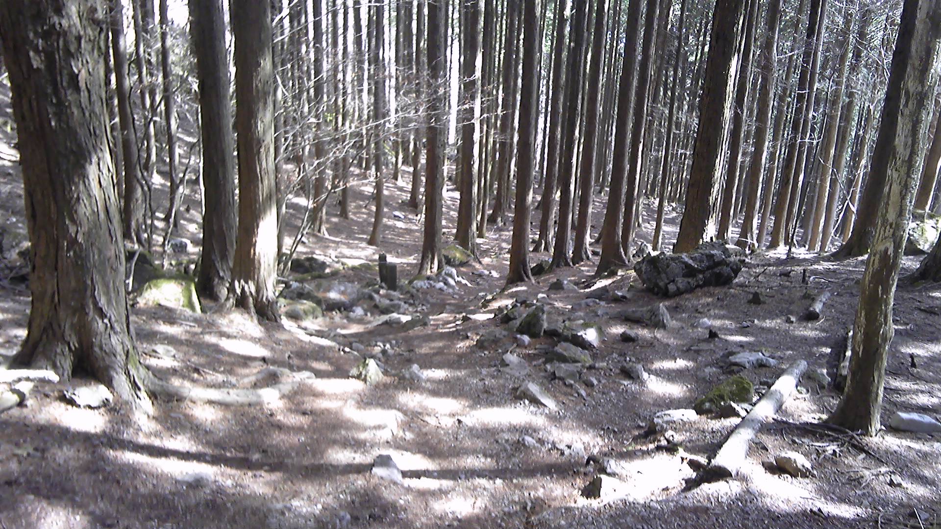 といえ、後から考えるとこれはベストの休憩場所であった。これから後、山頂付近も含めてベンチはなく、景色の開けた場所もほとんどなく、ただただ林の中を登ったり下ったりするだけなのである。結局、下り途中の大杉の広場まで、ベンチはなかったのではないだろうか。