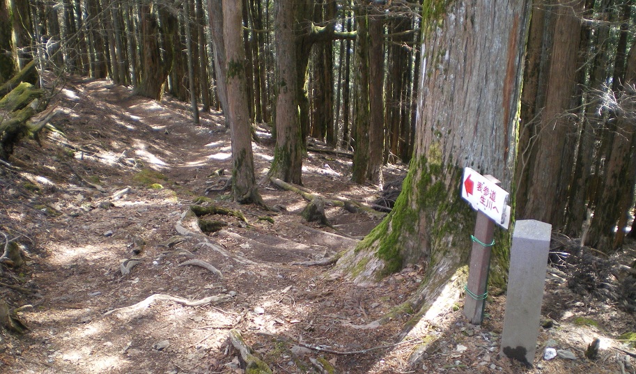 ようやくスイッチバックが終わると、斜面の左方向へ、次いで右方向へとトラバース道である。そして、唐突に分岐点に出た。そこから下るとシラジクボから小持山方面とある(分岐から一の鳥居へ向かう登山道は階段コースという名前だったが、土砂崩れで廃道)。