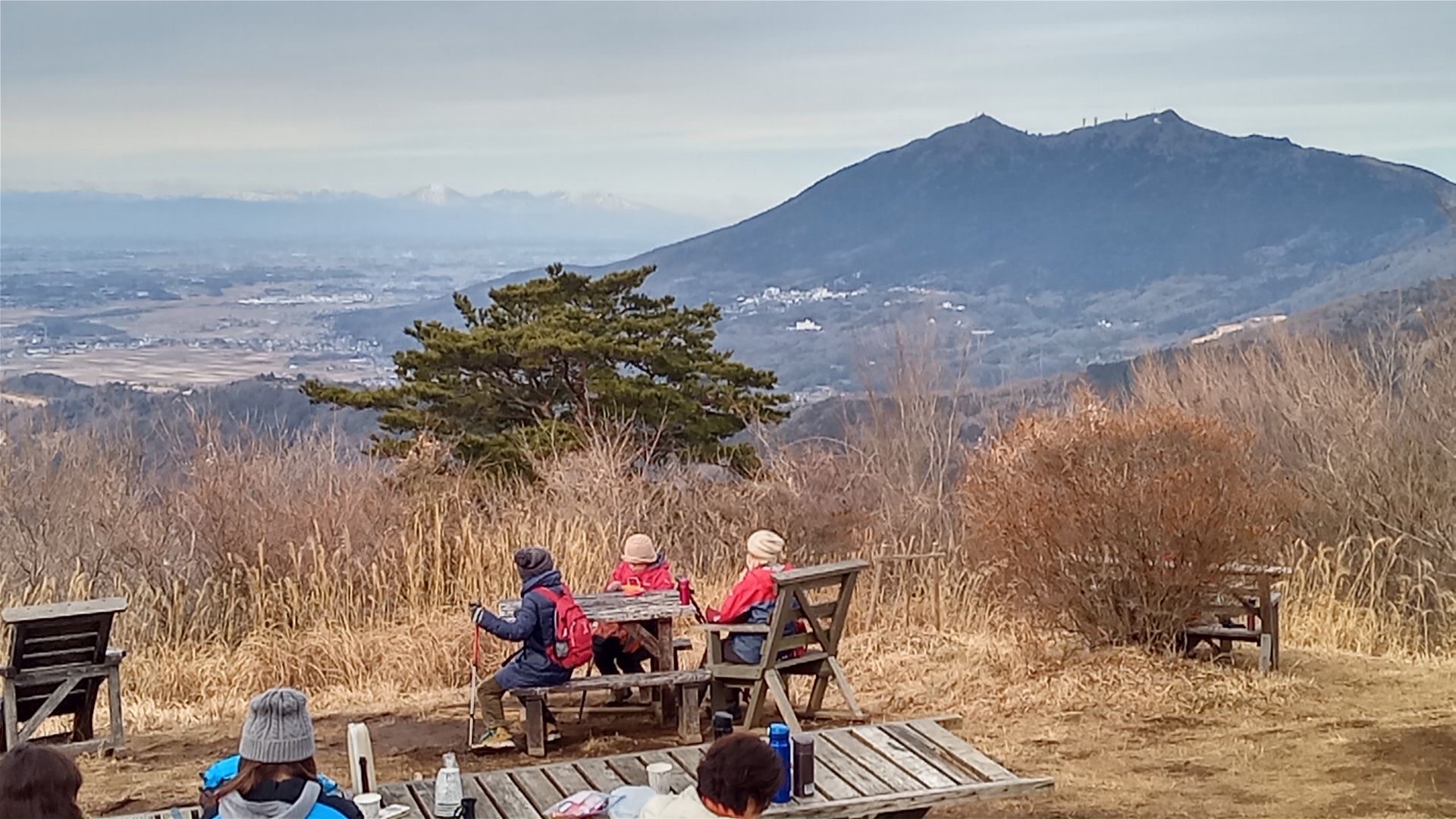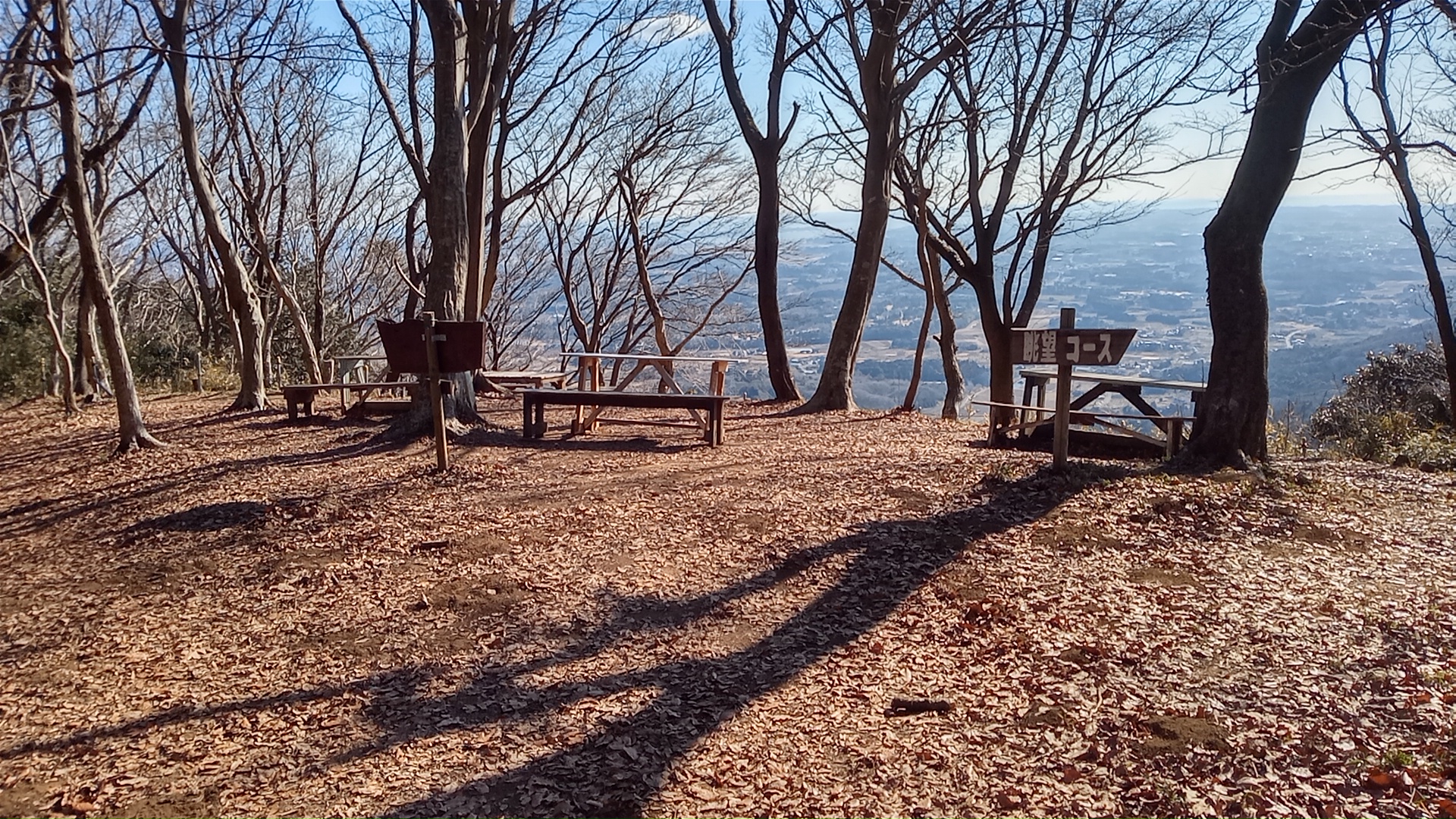 いい景色を見ながらお昼を食べる。2022年初めての山である。前回の筑波山1周ではお昼を食べたのがトイレ前ベンチだったので、こうして見晴らしのいい場所でゆっくりするのは久しぶりである。