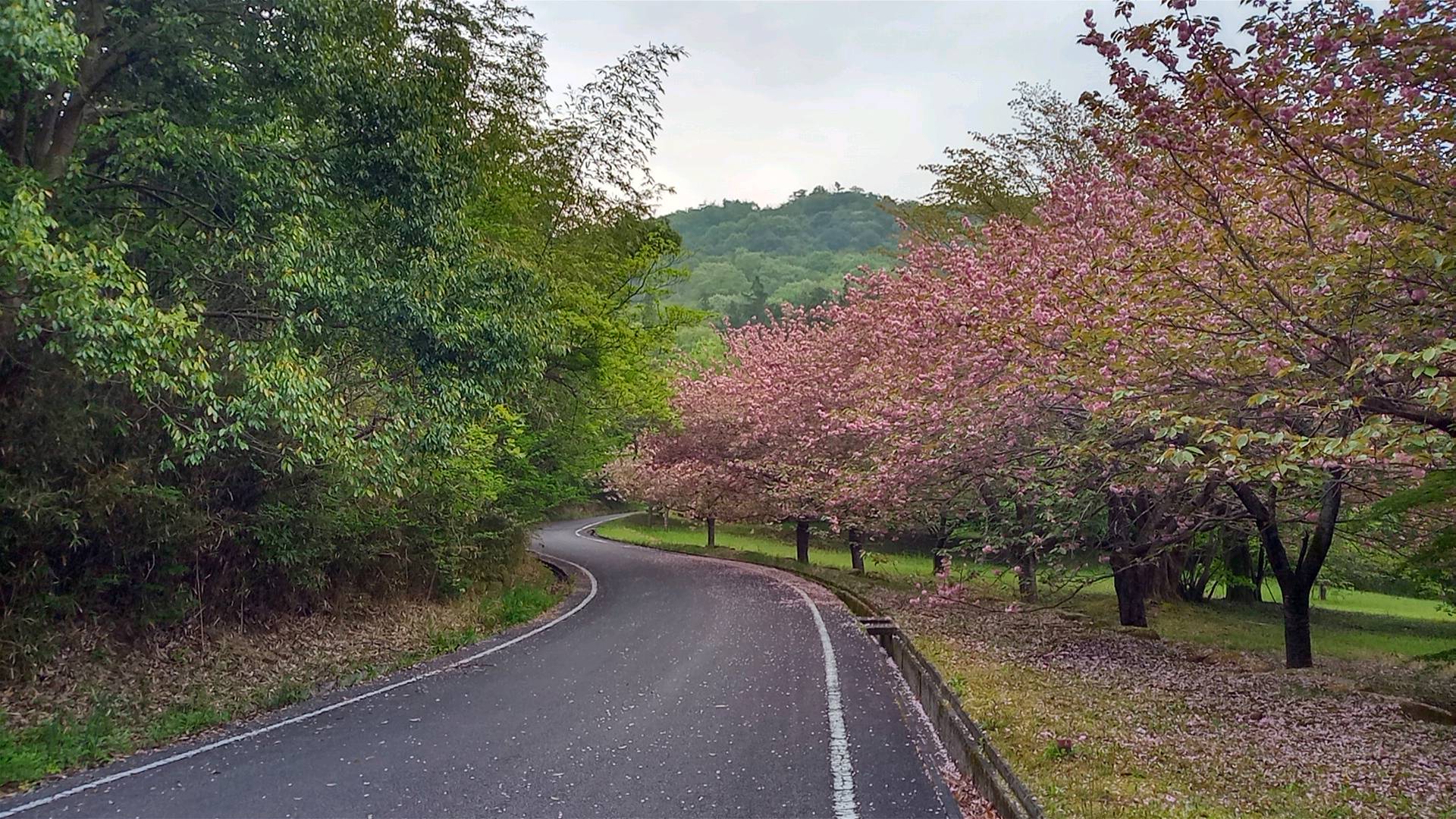 まず朝日峠からしばらく、パープルラインの車道歩きである。前回と違って、サーキットと間違えている車はいない。何しろ、ここは30km制限なのだ。10分ほど登ると、道は左右に分かれる。左はフルーツパークから旧八郷町中心部に向かう。右が雪入への道である。