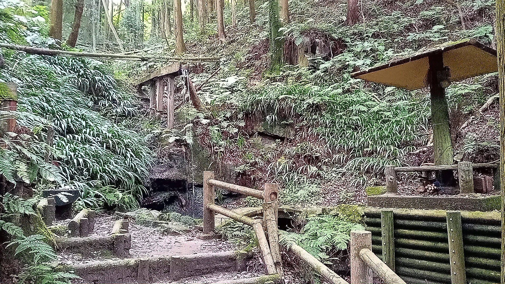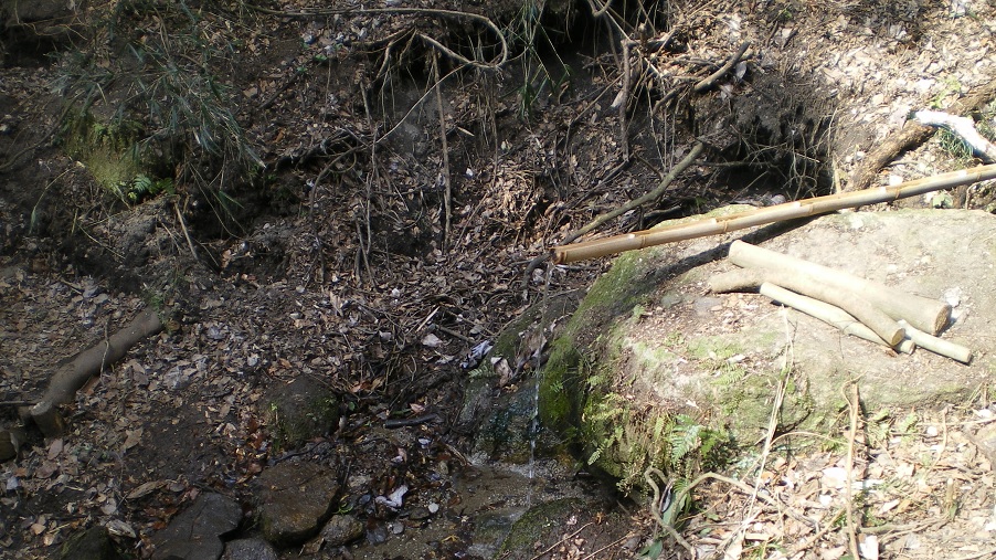 10分くらいで、洗顔沢休憩所という水の出ている場所に着く。「この水は飲めません」と書いてあるが、名前のとおり顔を洗う沢だろう。沢の水をすくいやすくするための樋がかけられている。さすがにこの時期は冷たいけれども。