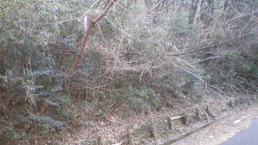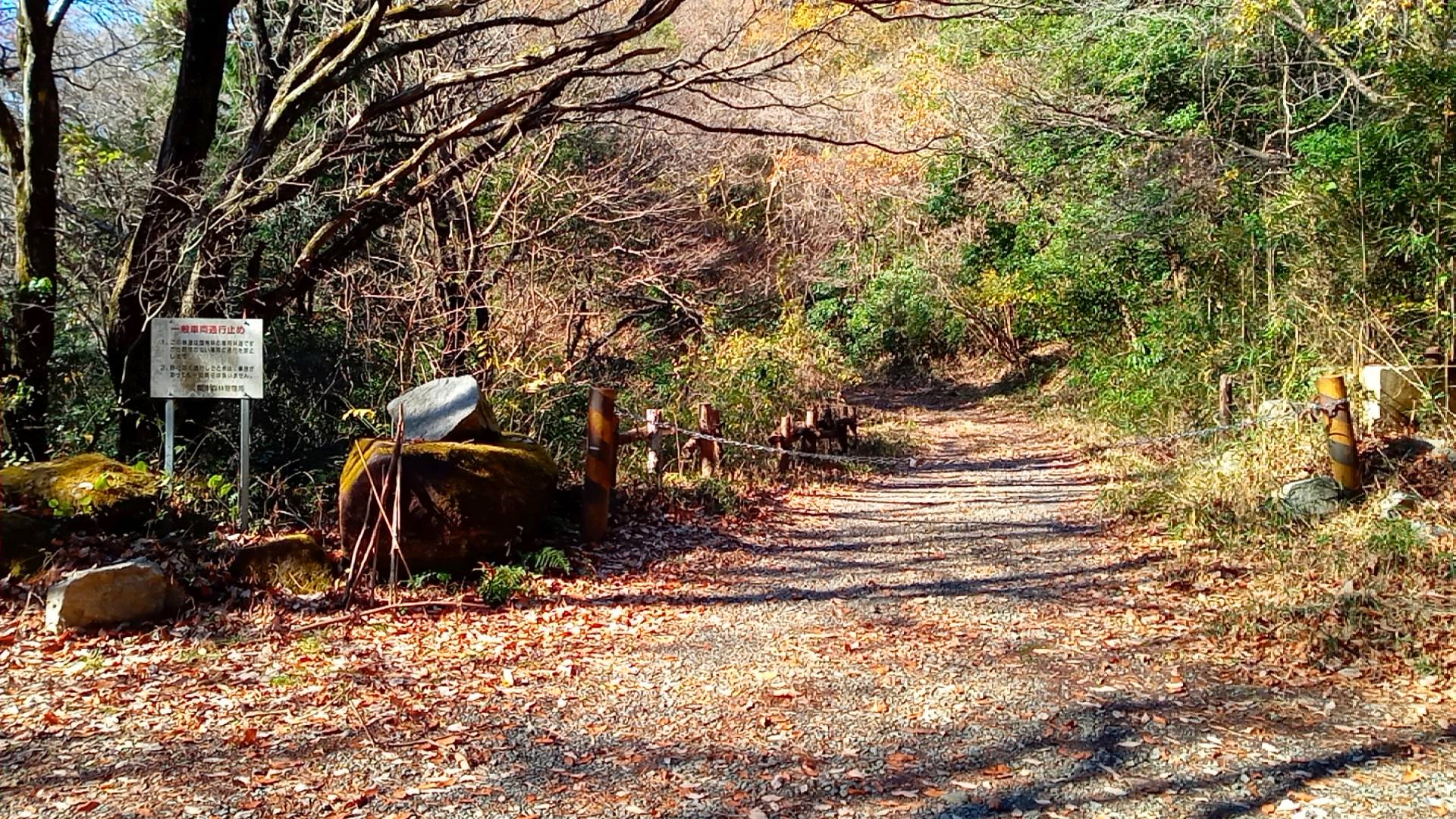 さらに5分ほど歩くと、左に分かれる舗装道路がある。通せんぼしてあったので、私道だといけないと思い先に進む。しかし、道は下る一方である。100mほどで引き返してよく見ると、通行止めゲートの横に踏み跡があった。