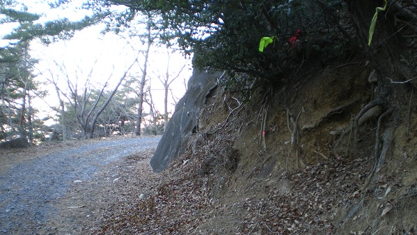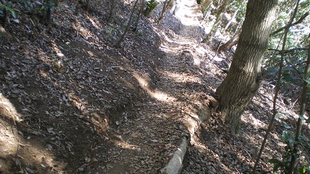 これが、アンテナ山まで伸びている施設保全用道路である。宝篋山に向かう道と同じ用途であるが、こちらの方が新しい工事だったのか、それほど古びてはいない。ただ、スイッチバックしながら急坂を登るのは変わらない。