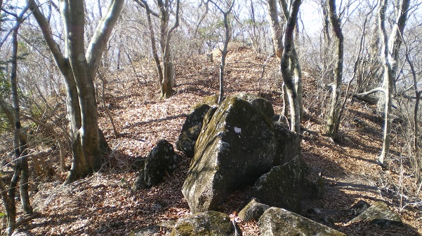 ただ、地面は筑波山周辺とは違い、比較的柔らかな土が多い。ところどころ木の根が張り出してうるさい場所はあるが、鳴虫山ほどではない。そして、主稜線を進むと頻繁に赤い札、境界見出標が現われる。ここも国有林なのだ。
