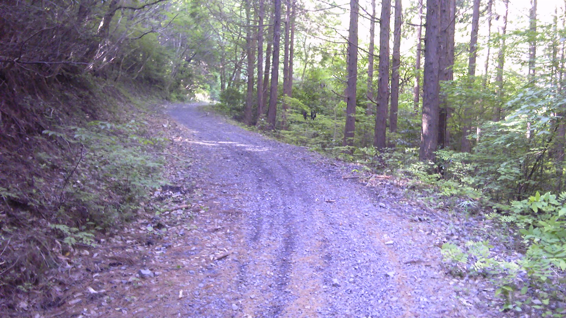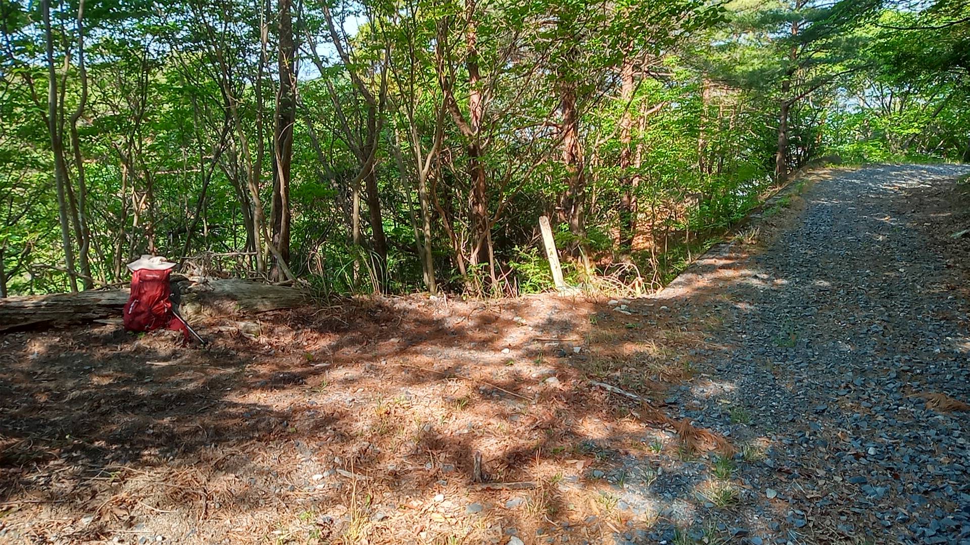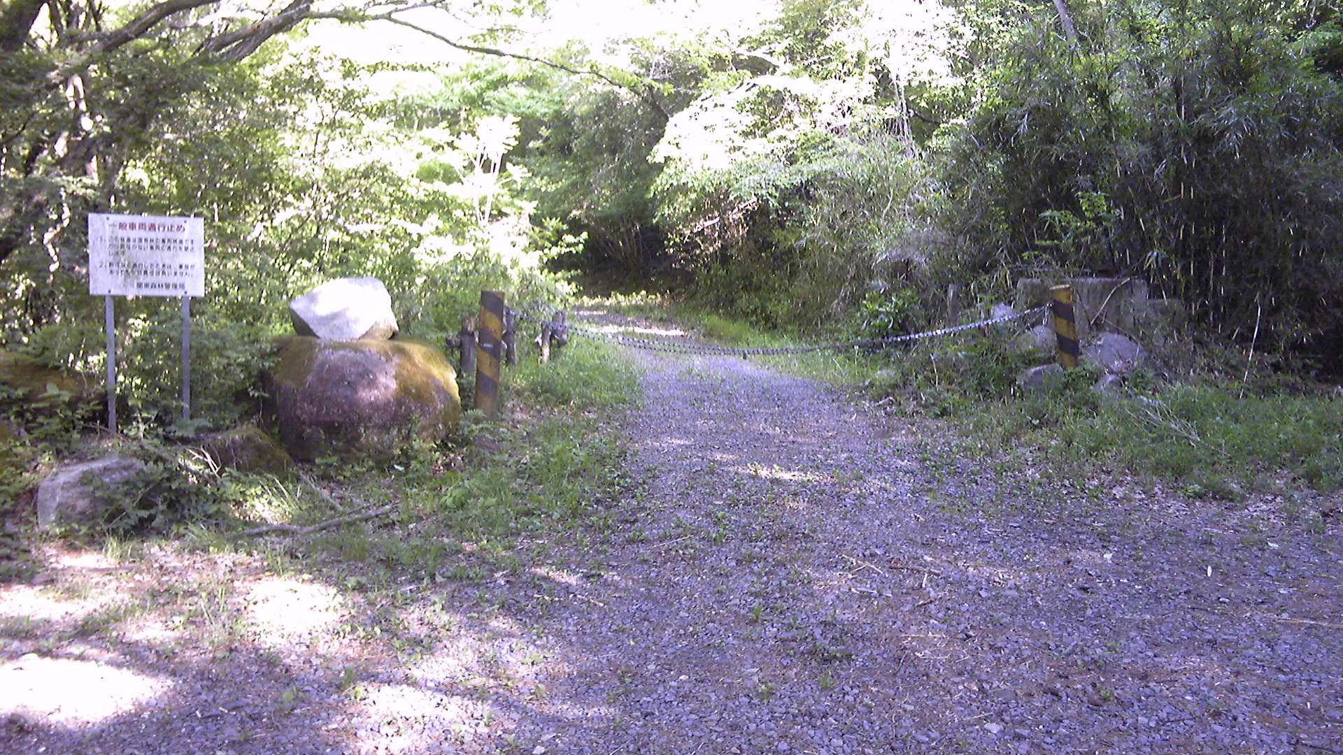 林道のヘアピンカーブが登りつめるあたりで合流し、分岐点には黄黒のトラロープが張られていた。「天罰下る」は貼ってなかったので、おそらく車両通行止めの意味かと思われる。