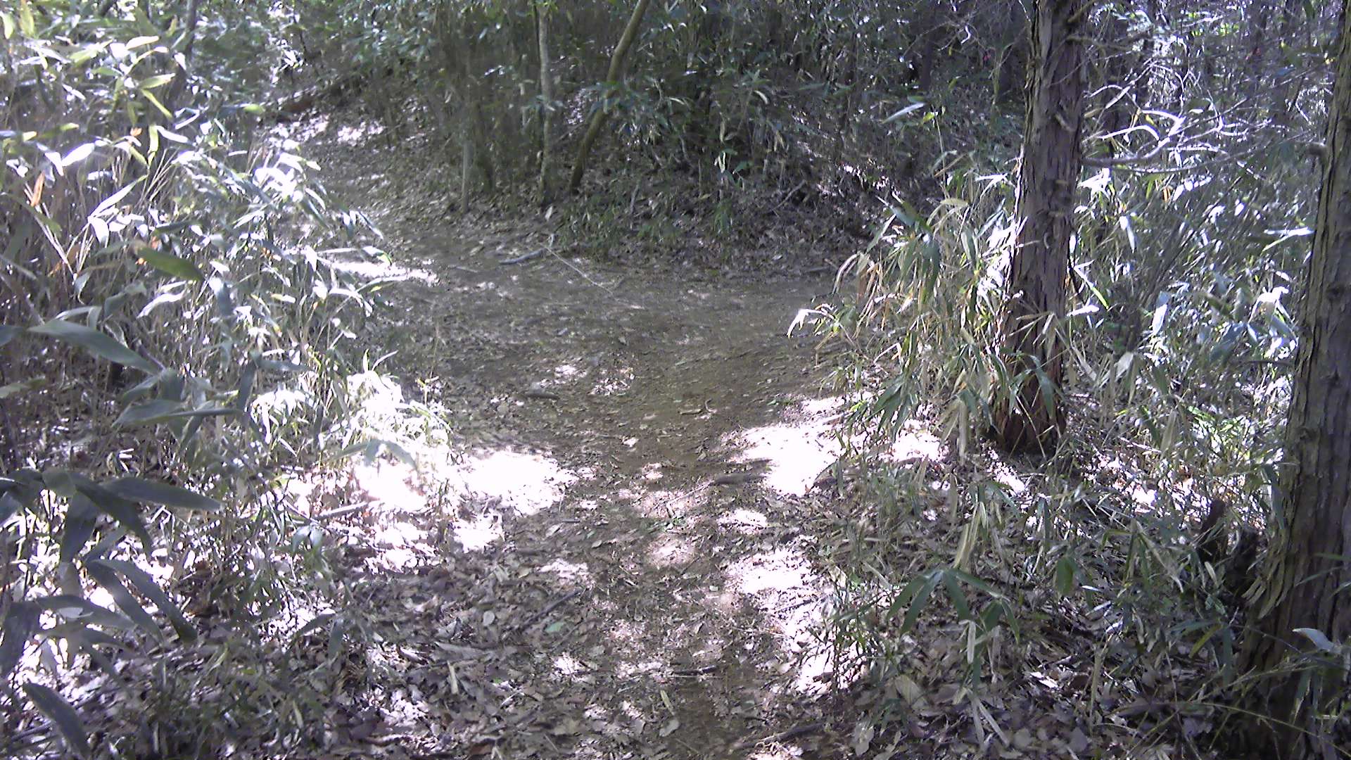 このルートは今日登ったみかん園ルートと谷を挟んで対岸にあたり、右の坊主山が朝と同じように見える。石置尾根をそのまま下ると梅林寄りに出てしまうので、途中から八五山ルートに入る計画だったのである。